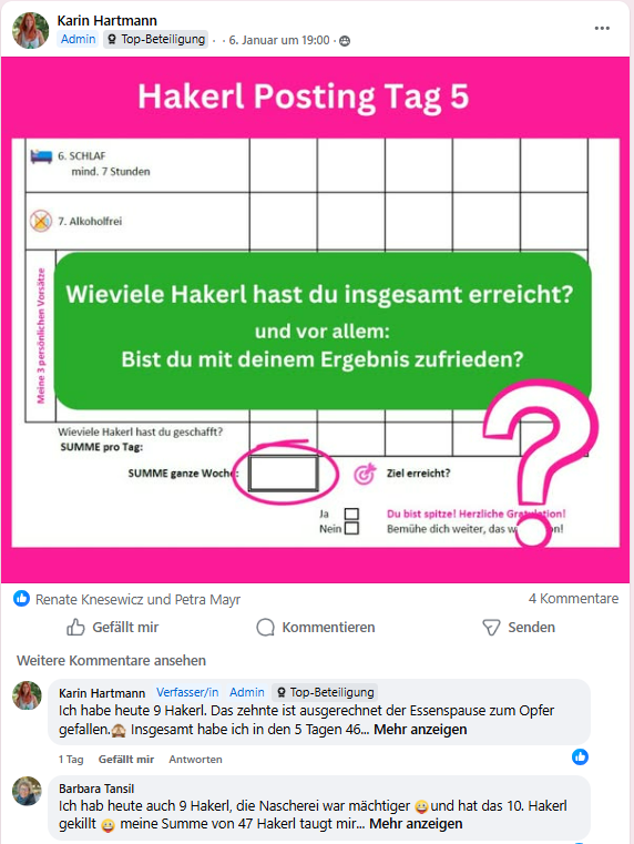 • Barbara: „Mir hat die Challenge super gut gefallen. Erstmal hat alles super funktioniert, was die Technik betrifft – Anmeldung, Einstieg in die FB Gruppe etc. Das Skriptum ist toll – übersichtlich, leicht verständlich Die Motivation ist durch das Abhaken der Aufgaben gegeben, voll cool! 5 Tage sind ein für alle machbarer Zeitraum – gut gewählt Mein Bewusstsein für die Gestaltung eines gesünderen Alltags wurde wieder in Aktion gerufen! Speziell die tägl. 30 Minuten Bewegung haben so gut getan.“