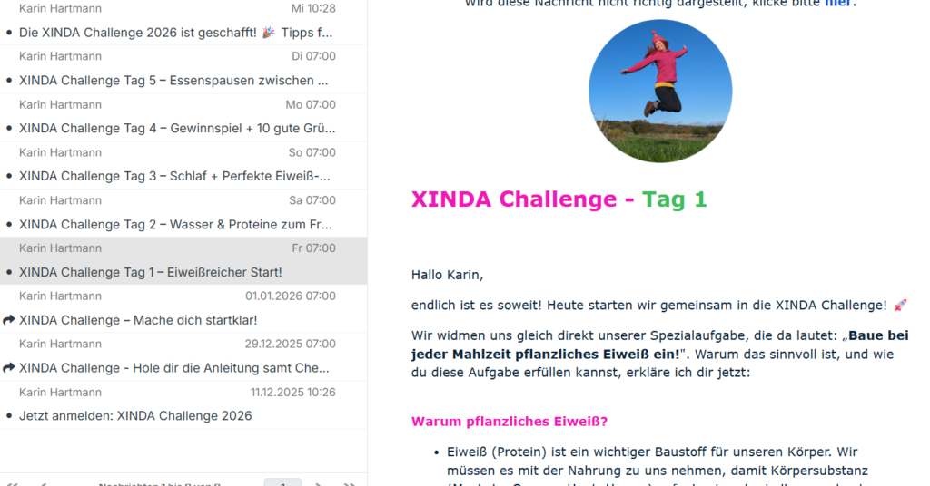 Meine beliebte XINDA Online Challenge zu Jahresbeginn war wieder ein voller Erfolg! 🎉 83 gesundheitsbewusste Menschen haben mein Geschenk angenommen und waren mit großer Begeisterung dabei! 🎁 Von 2. bis 6. Jänner haben wir gemeinsam gesunde Gewohnheiten und persönliche Vorsätze praktiziert, und dafür fleißig Hakerl auf unserer Checkliste gesammelt. Die Rückmeldungen sind phänomenal. 🤩 Ich habe wirklich eine Riesenfreude, dass ich so vielen Menschen mit wertvollem Wissen und genialen Tools einen gesunden Start ins neue Jahr ermöglichen konnte. Unser aller Gesundheit liegt mir nämlich sehr am Herzen. Denn ihr wisst: „Pumperlxund bis 104“, lautet das Motto. 😉